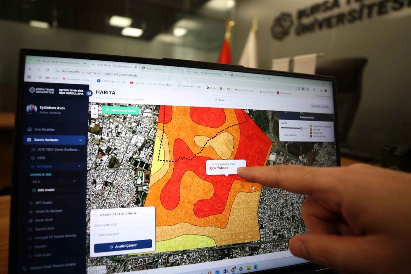 Bursa Teknik Üniversitesi (BTÜ) akademisyenleri, yaklaşık 3 yıllık bilimsel çalışmaların ardından geliştirdiği yazılımla vatandaşların, binaların deprem dayanıklılığı, zemin sıvılaşması ve risk durumunu tek tuşla sorgulayabilmesini sağladı. Sistem şimdilik Bursa Yıldırım ilçesinde aktif ve ücretsiz hizmet veriyor.